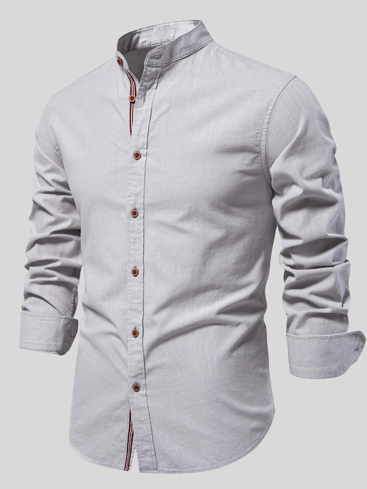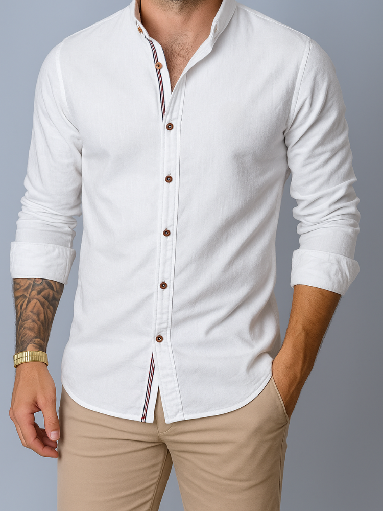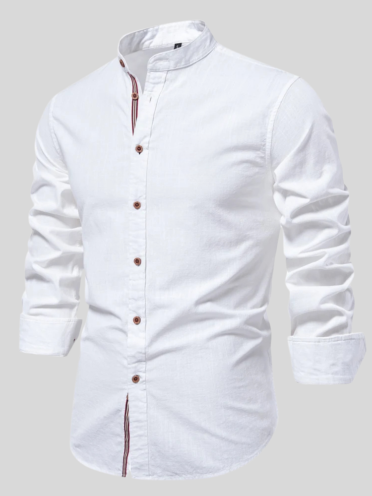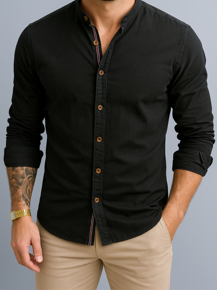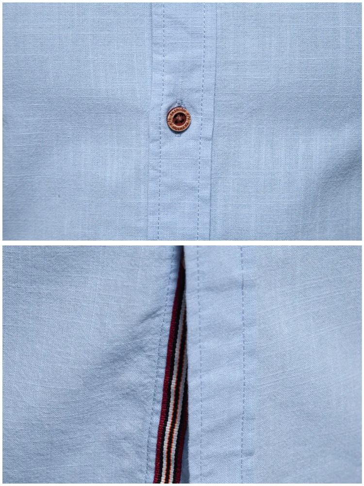 Mandarin collar, tricolor stripe, brown buttons—a fusion of classic tailoring with modern style.