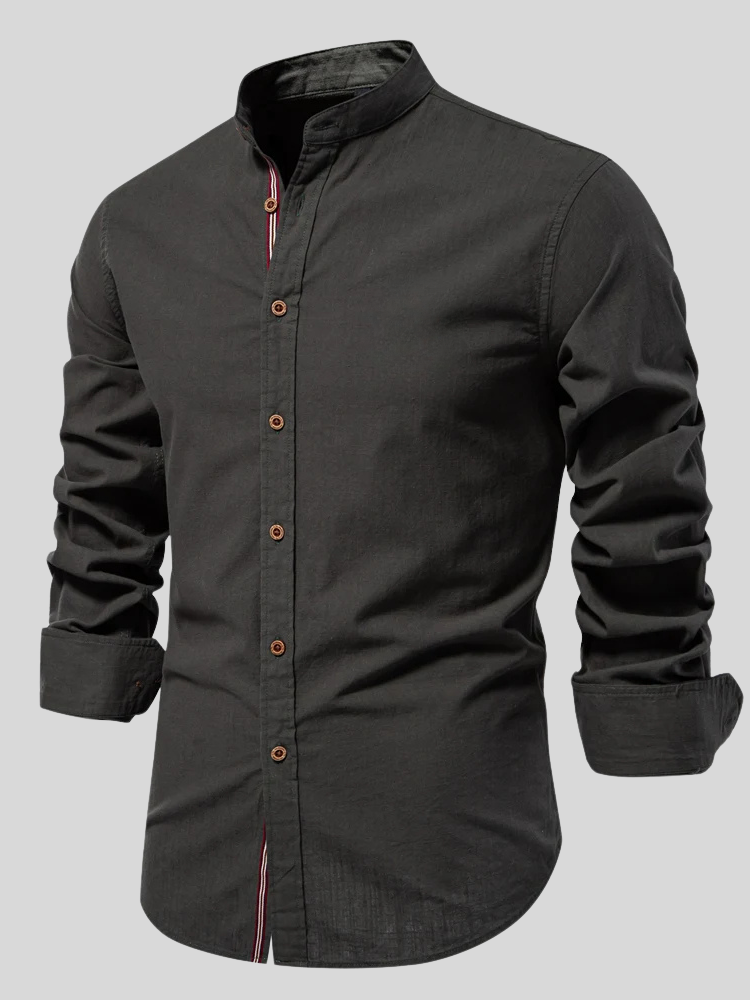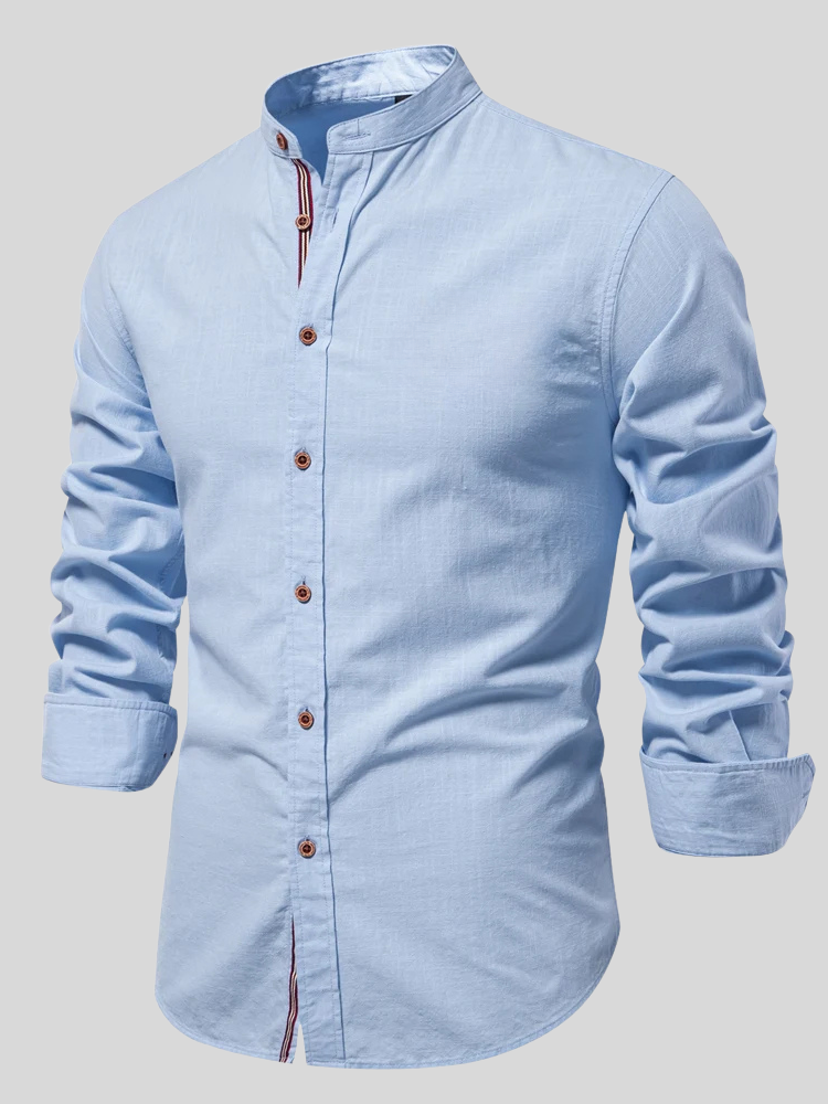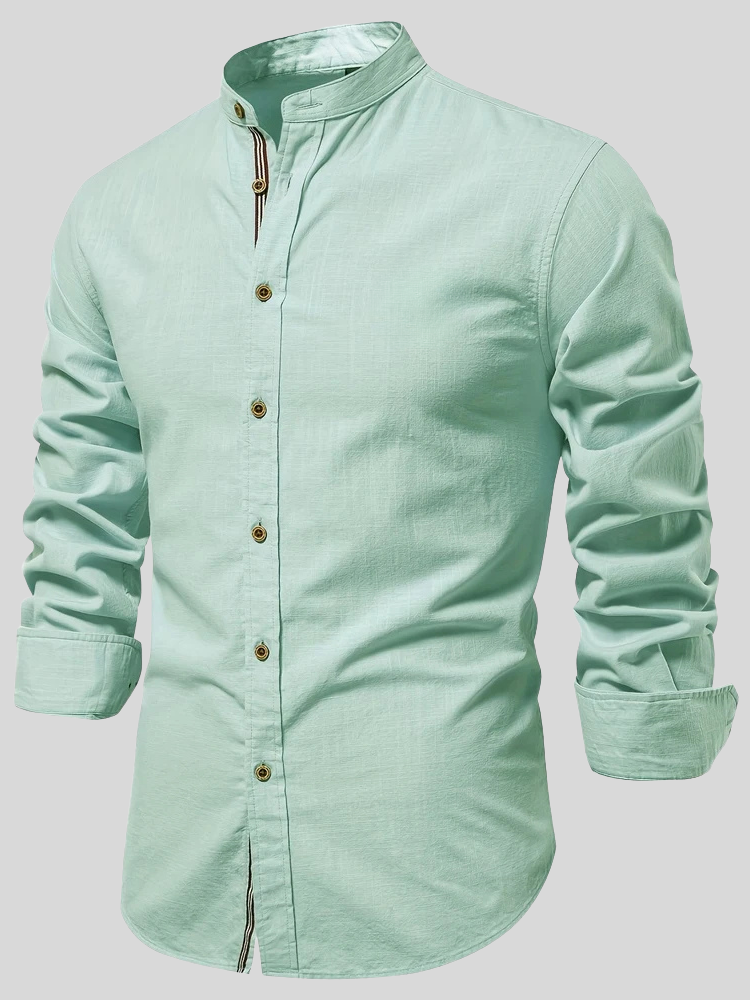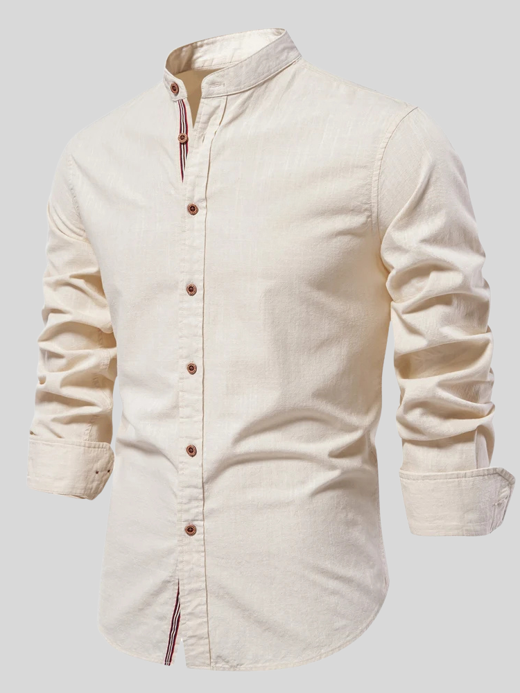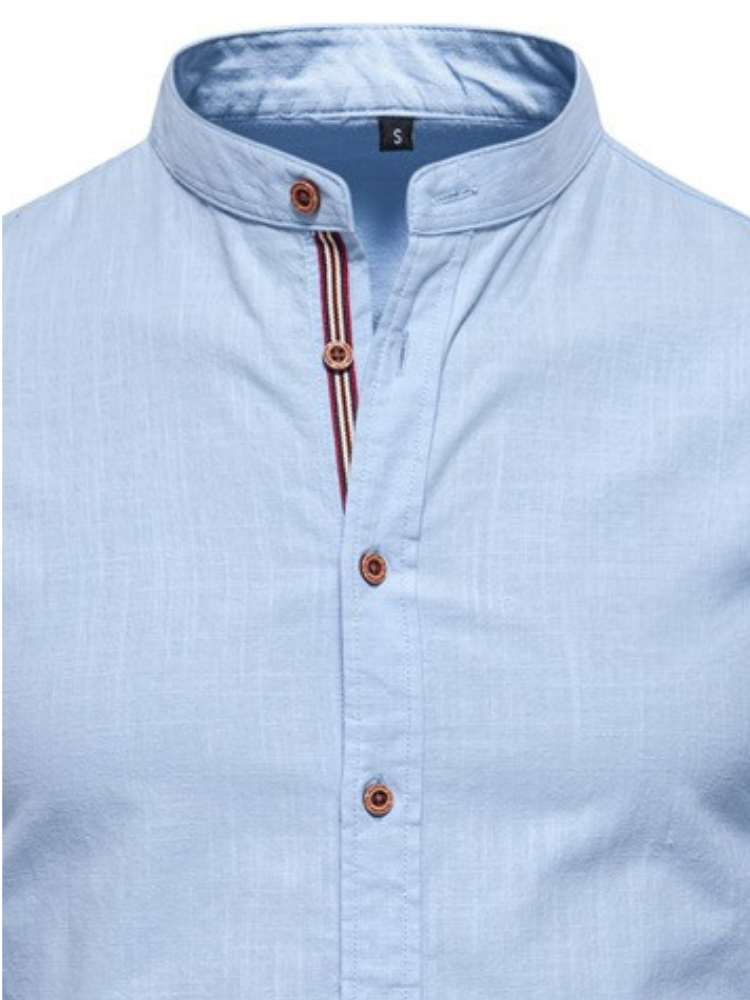 Mandarin collar, tricolor stripe, brown buttons—a fusion of classic tailoring with modern style.